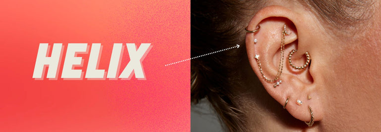 A helix piercing is placed in the outer cartilage of the ear, and it takes about 6 to 14 months to heal. You can typically wear any stud (depending on your ear shape), but unfortunately, hoops aren't recommended until you're fully healed!
